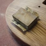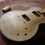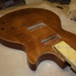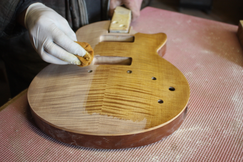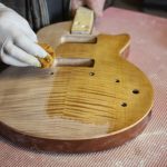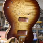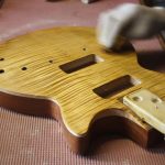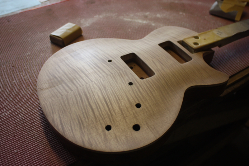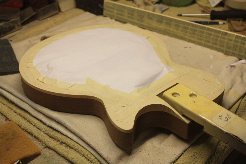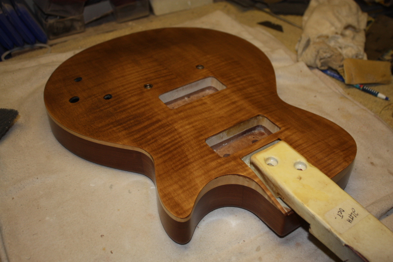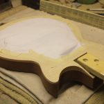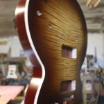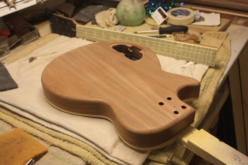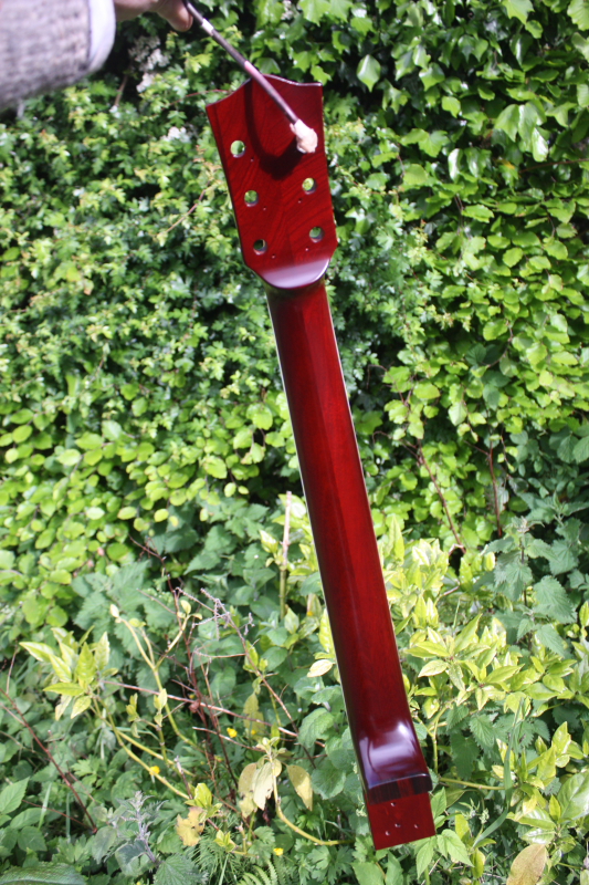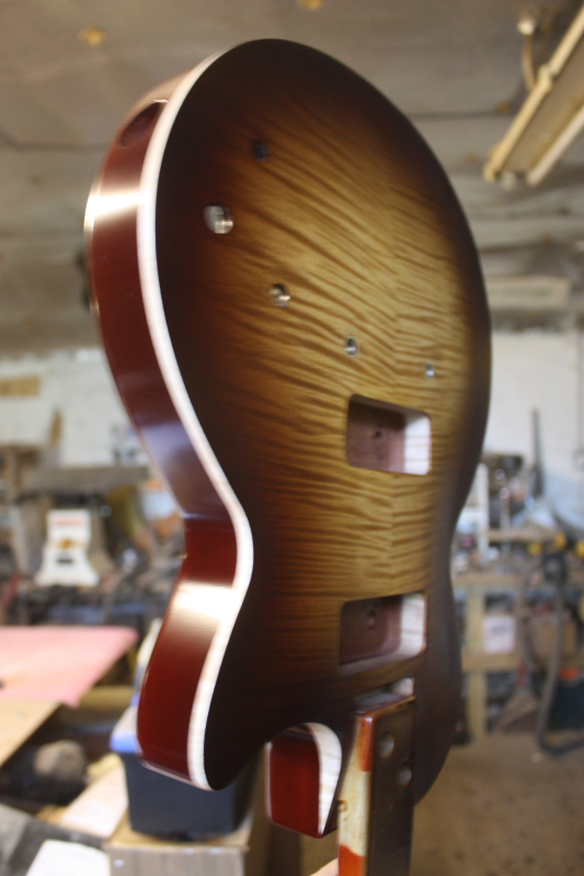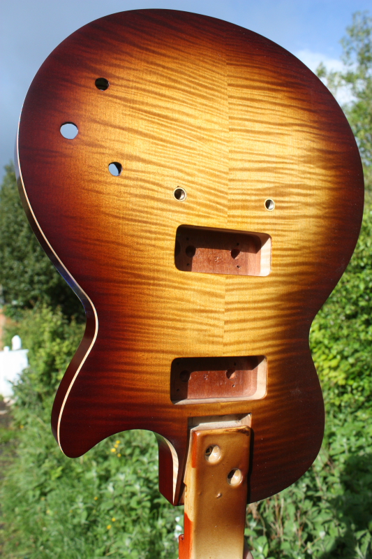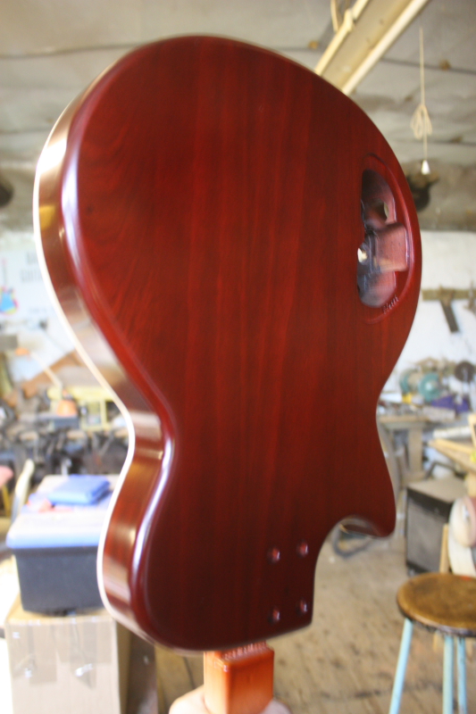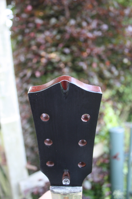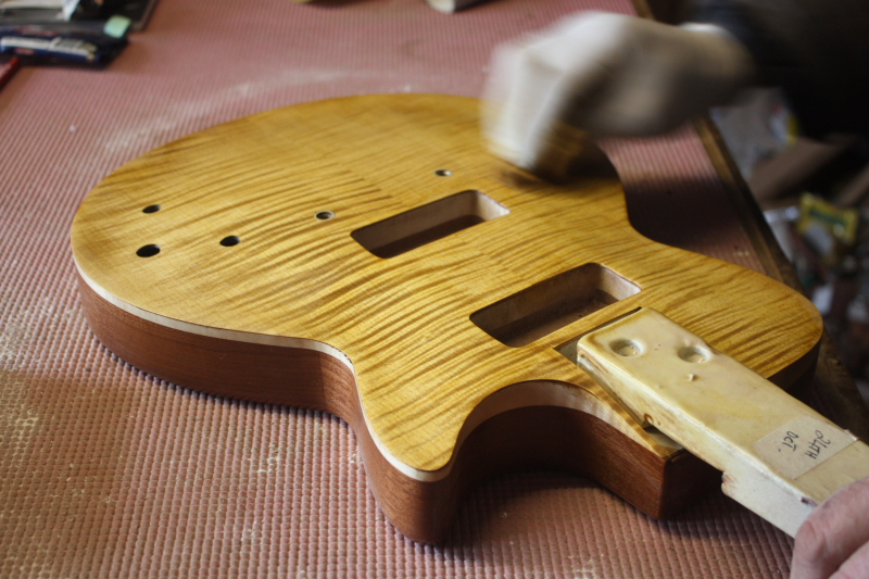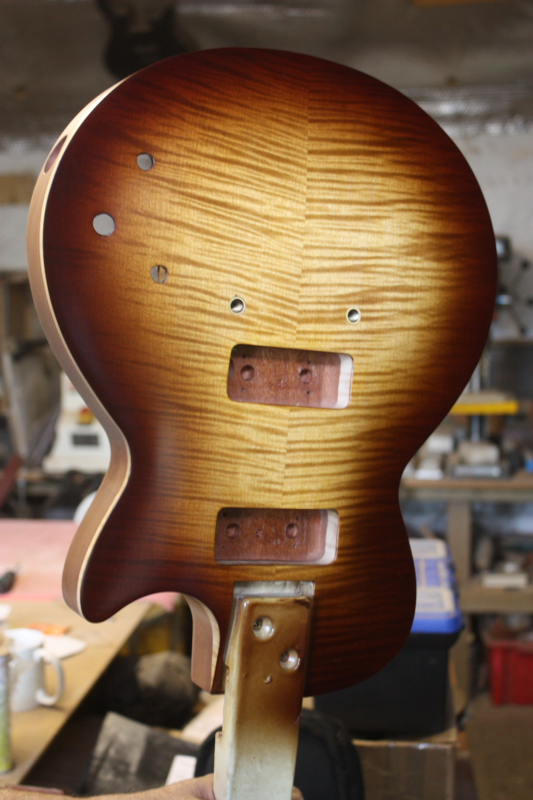 So it is a true honour to be given the task of finishing this, his last guitar. The colour and base-coats were sprayed last week. We applied the headstock decal bearing his name yesterday, and the last of the build coats will be done today. The guitar is in good hands, we are determined to make sure it is completed to the highest order just as Jim would have done.