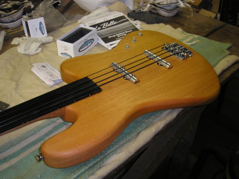 Some instruments, like this bass, just have something nice about them. It is just a standard really, mahogany neck and body with an ebony fingerboard, but it definately has the x factor. Just wait till it gets the knobs on….