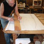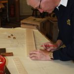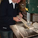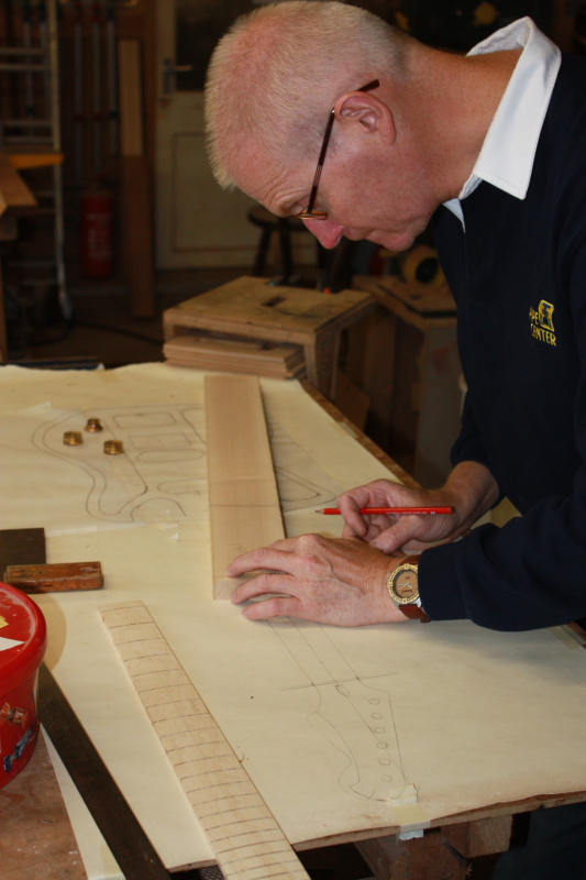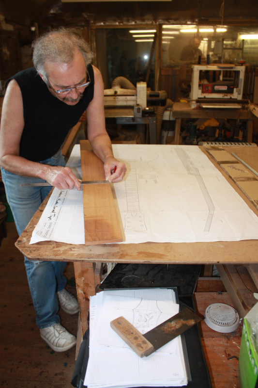 Kevin has a more difficult task as the truss rod goes into the back of the neck and will be hidden with a fillet of wood or ‘skunk stripe’. He has band-sawn his neck out, drilled his tuner holes, glued his fretboard on and routed his truss rod slot. He also took a tracing from his drawing to use for marking out the body. Tomorrow he will finish installing his truss rod, carve the neck and possibly make a start on the body.