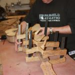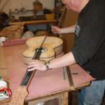 Duncan got his fretboard glued on early so he could begin carving his neck in the afternoon. While it was drying he started to make an ebony bridge. He got the pin holes and saddle slot cut which are the tricky bits. Before he left he fitted his newly carved neck back on to check the feel. Next time he comes he will be mostly inlaying gold mother of pearl crown inlays into his fretboard.