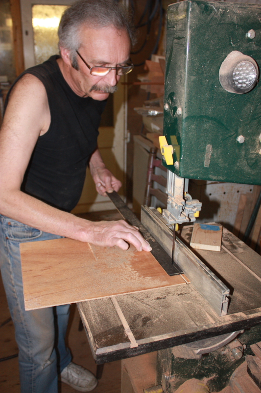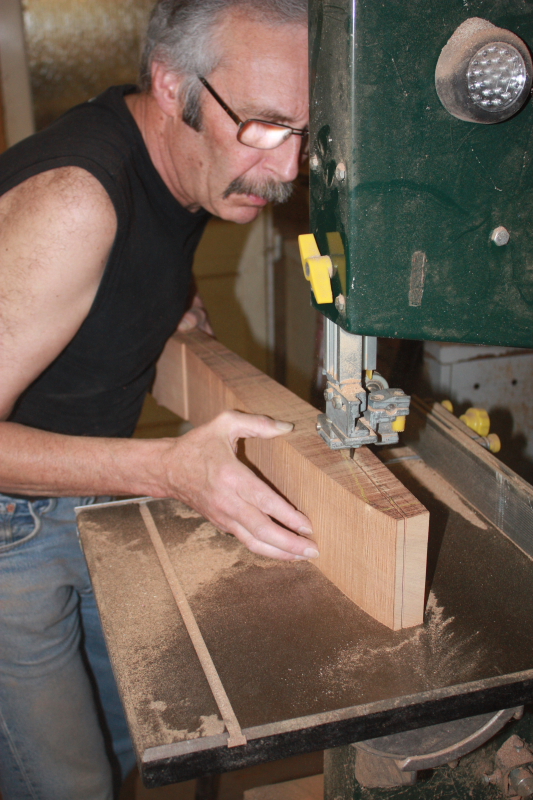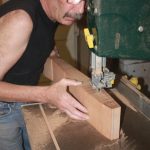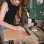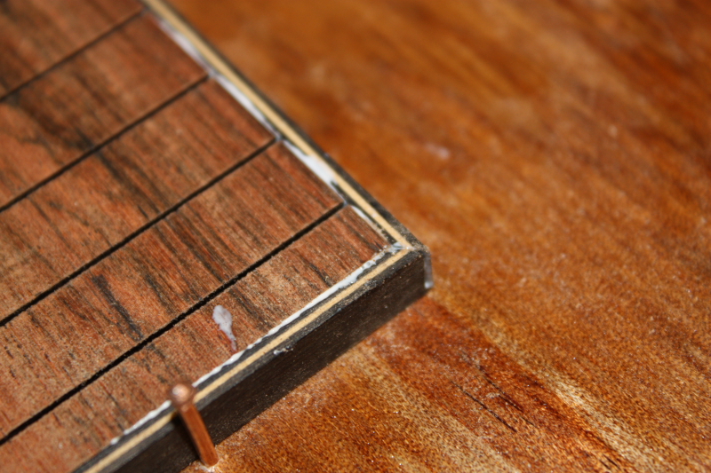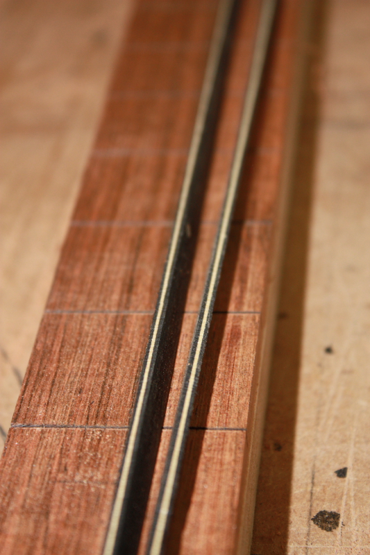 Dave’s set neck design has an angled back headstock which requires a thicker piece of wood than a bolt on, parallel headstock design like Kevins (below). His truss rod is fitted under the fretboard into a simple straight slot. He roughed out his neck on the band-saw and then cut the binding strips from the sheet he glued yesterday. They came out looking great so we glued them on. Tomorrow the fret slots will need to be re-cut through the ‘black white black’ before the outside strips of rosewood can be glued into place, then he can get his fretboard glued on.