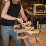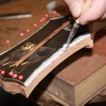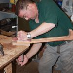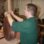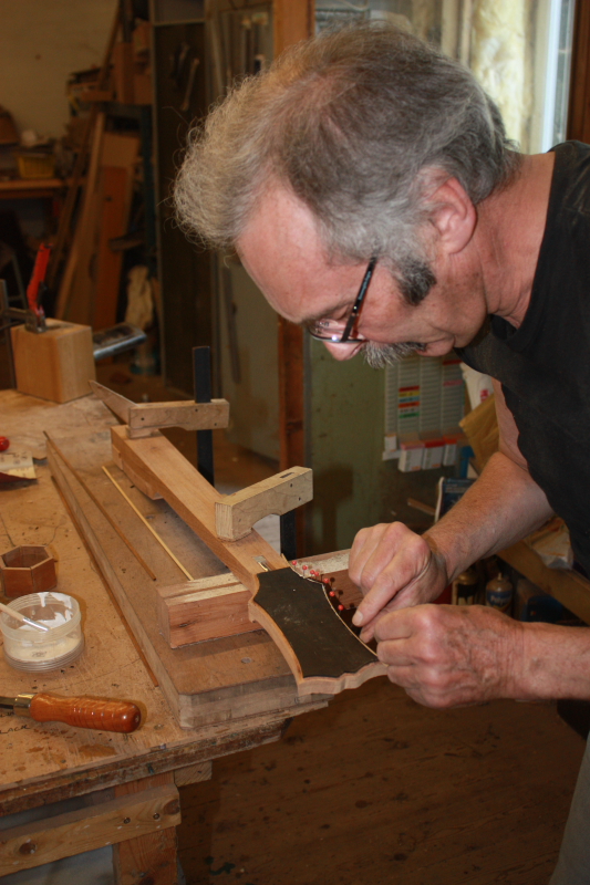 Nick (acoustic) completed his neck angle and then made and installed a truss rod before cleaning the inlays from yesterday and gluing on his fretboard. Any spare time he had was taken up scraping and sanding the binding on the body that he glued yesterday.
