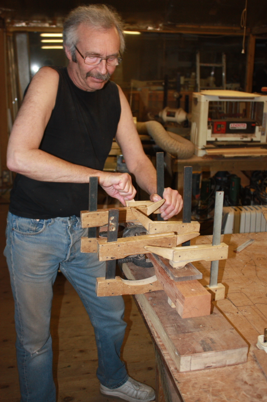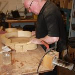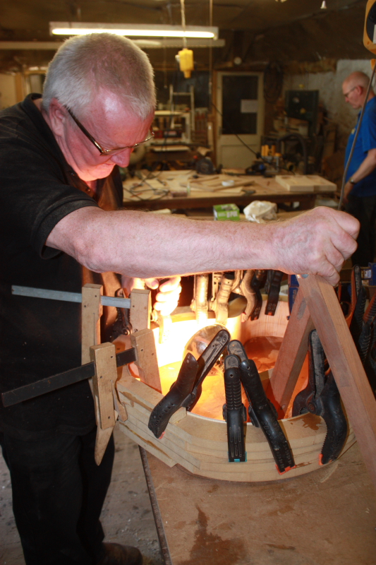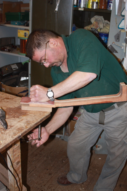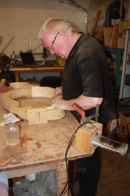 Stevie (bass) stepped in to carry on with his 5 string fretless archtop bass. Last time we tried to bend his sides which was a bit of a trial as the wood is so highly figured it started to fracture, so this morning I showed him how to make a mould. While the glue was drying he returned to carving his back plate which is now starting to look really nice. After dinner he used his new mould to complete the side bending. We used a heat lamp to warm up the dampened sides until they were steaming, then clamped them into the mould to perfect the shape.