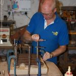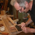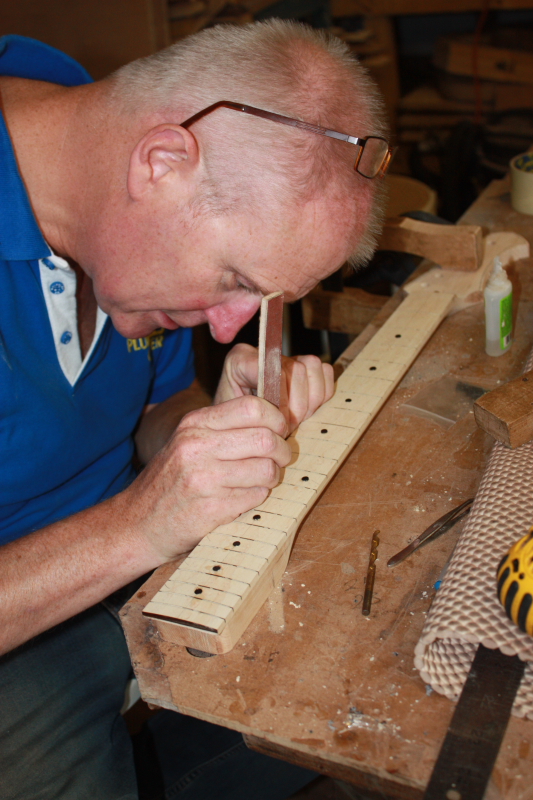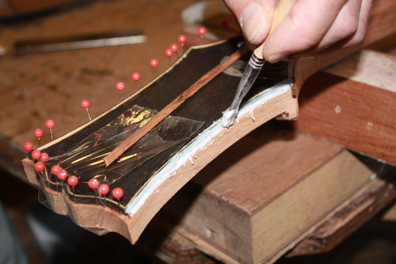 Dave (set neck) has been working on his headstock veneer with custom binding. We used a test piece to practice on to make sure we had everything right before cutting the channel around the headstock. The black/white/black strip had to be bent, mitred and glued first, with pins to hold it in place. Afterwards the outside strip of rosewood was glued and held in place by clear tape. This procedure took over half a day and is not for the faint hearted but the results will be spectacular. Dave’s last job today was to glue on his fretboard.