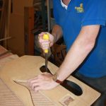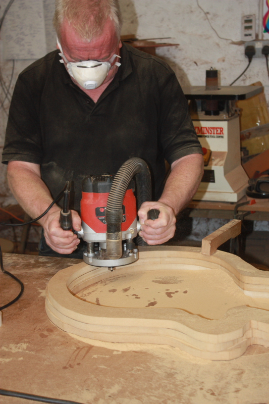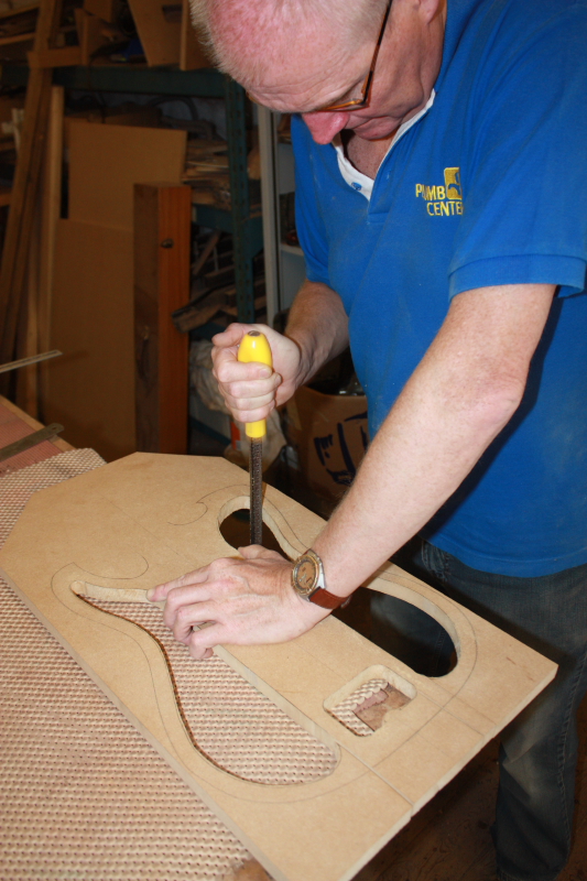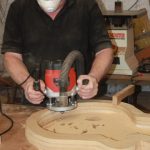 Kevin (bolt on) got his inlays in before first break and also cut his nut slot so his fret board could be sprayed. He then spent the rest of the day working on the body. Kevin spent a while making a pattern for the sound chambers which had to be routed into the body. After that he cut the shape into the cap before it gluing it on last thing.