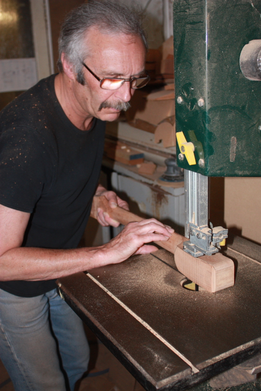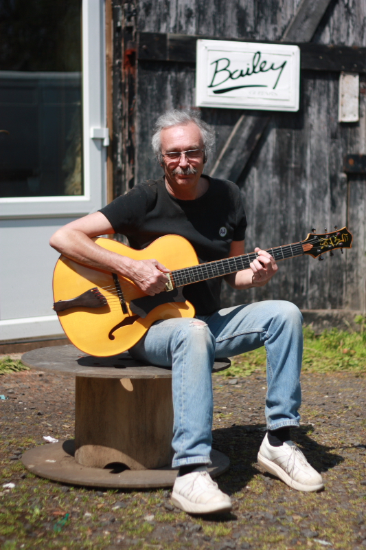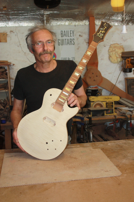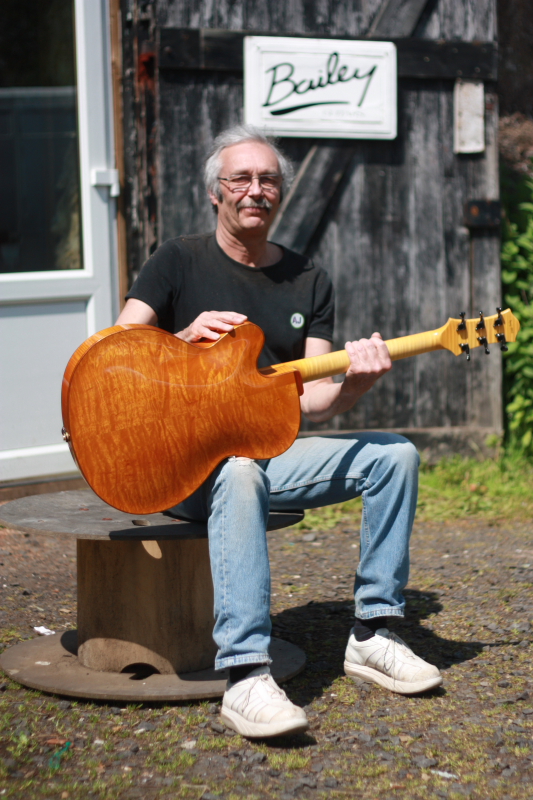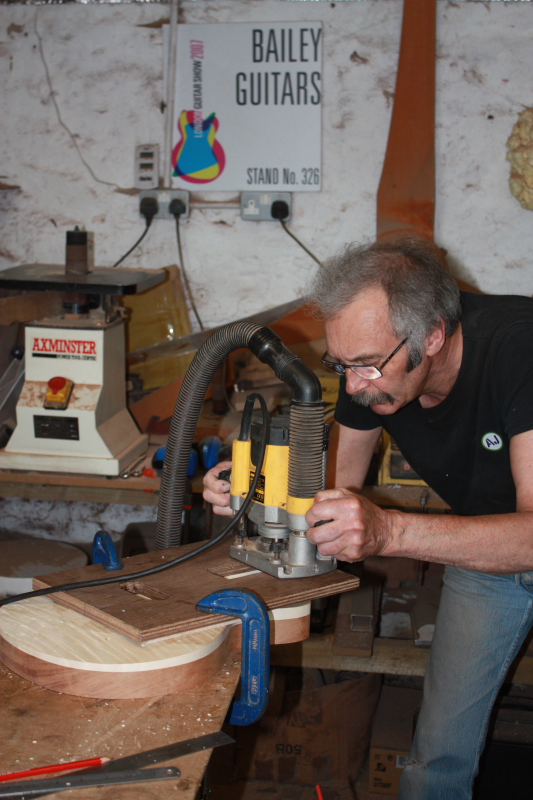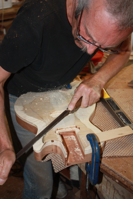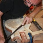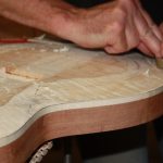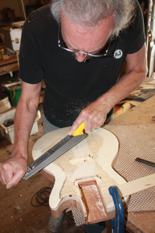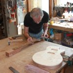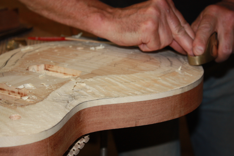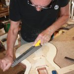 Dave was up against it from the start with such a high spec design but had always planned on a full gloss for his guitar so was always intending to leave it with us for spraying. At break time Dave got out the Archtop he made here with us last year so I could take some photos. Then it was straight back back to work. As it was just me and him in the workshop progress was very fast. He made short work of drilling holes for the the pick up wires, strap stud and jack socket. The neck joint has now been done and the top is now carved. We won’t worry too much about making him sand it perfectly as we are going to spray it here anyway we can finish that for him.