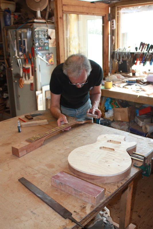 We ask our course participants to keep the morning after the course free, for any tweaking time that may be necessary for niggles that there wasn’t time to fix. It gives them chance to really try out the guitar to make sure everything is OK before they take it away. Some of these guitars go a long way home so it is important to have this time to make sure everything is as it should be. Mostly it is not needed- Nick and Kevin didn’t need it but Dave certainly will.