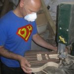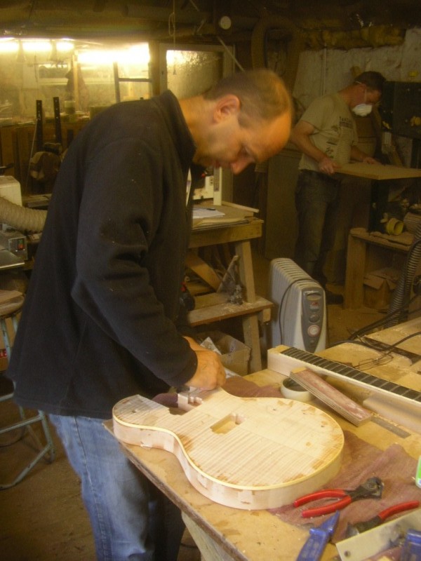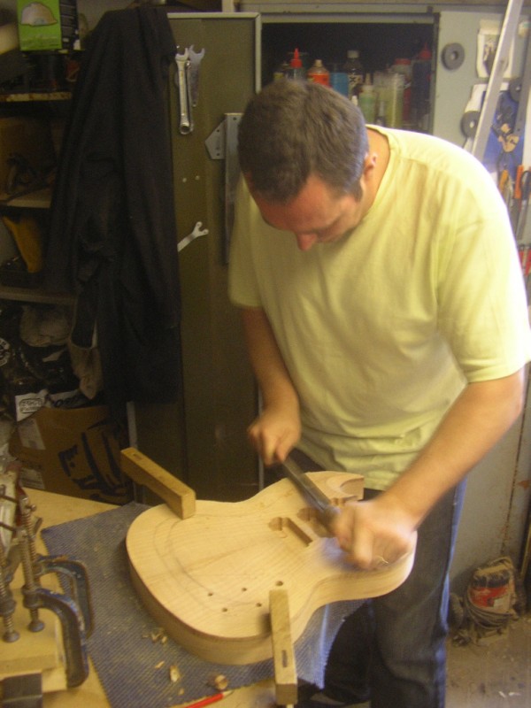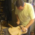 Day 6: The calm before the storm……most of the day was spent working on the bodies. Hans’ body was quite complicted and very small with not a lot of room for error. Paul spent a long time time carving the neck join on his thru neck bass. Luc did the binding on his body. Steve finished carving his body. All fairly stress free……
