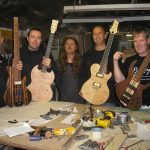Day 7: Sanding storm! Also drilling the holes to mount the hardware and checking the fit of all parts. This is where time started to run away with us. Steve and Luc had to glue their necks in before handing the guitars over to Billy for spraying. The guitars are left overnight to dry ready for assembly tommorow. Lets just say we worked late…….But not as late as Billy who worked into the night to get them sprayed ready for the morning. Thanks Billy!