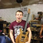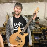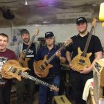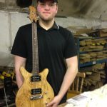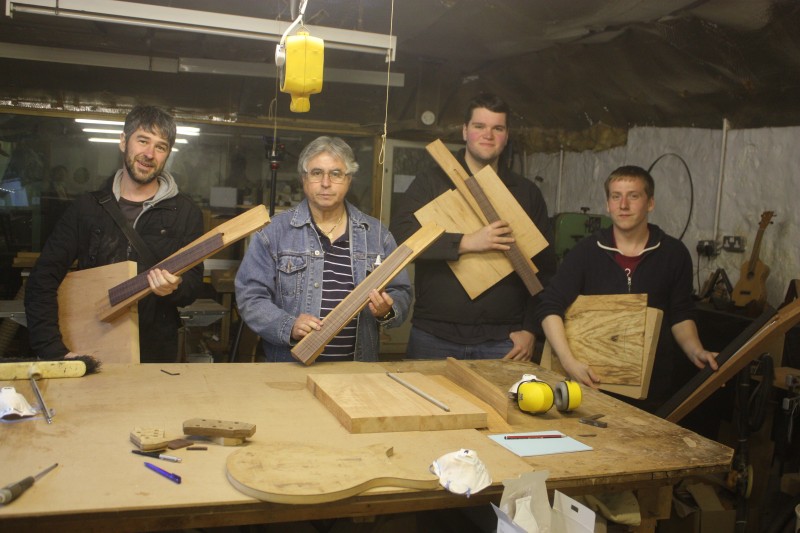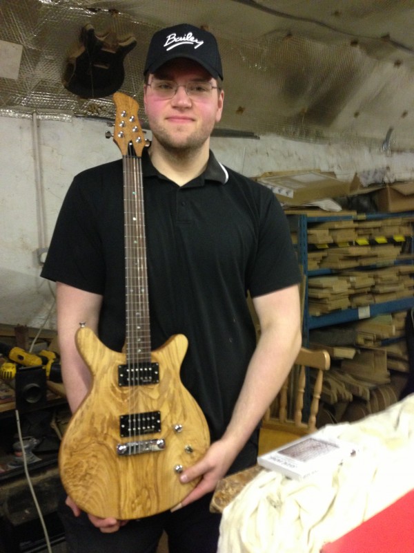 This is the most basic ‘build’ course we run, basically you make a Bailey Bandsman style guitar, but as you can see there is still some scope for customisation…Gavin chose to have a P90 in the neck position and a chrome cover on his bridge humbucker. Neil and James chose native ash and spalted maple respectively from our multitudinous selection of caps, two of the guys opted for thinner bodies. James also went for a tunamatic bridge with stop tailpiece in place of the standard Wilkinson Bridge. Rene’s guitar is probably the most ‘standard’ as he didn’t opt for any of the extras, but it is still a very lovely guitar as you will have heard if you tuned in to the livestream.