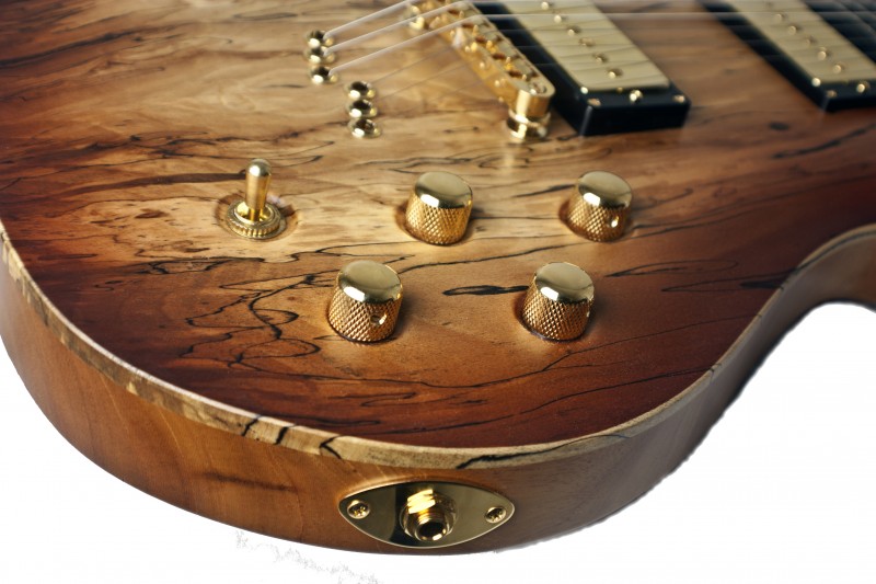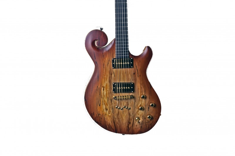 And well he did chose. The scroll and two tone headstock are standout features, both designed by David himself – with a little help from us 🙂 The Scroll is not easy to carve, especially in spalted wood, and even harder to spray especially with the fake binding! The two tone headstock is a first on the course on our course – Nice work Billy and David – Not bad for a first guitar…