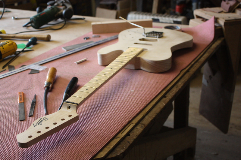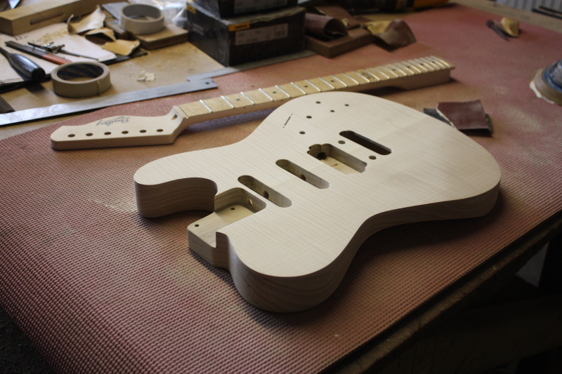 Just to make sure everything fitted and worked how it should, I strung it up for a test. As a result, I decided to change the neck angle slightly, a few small adjustments to the trem route and it all checked out brilliantly. After this the guitar was disassembled and then sanded ready for spraying.