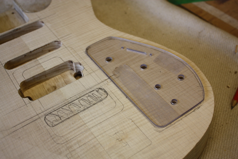 That just about covered everything, so after he left I spent the rest of the afternoon and the next day working on the body. This included routing for the tremolo and the control cavity, drilling all the holes: jack socket and pick-up link holes, and all the mounting holes for the hardware that is going on this guitar. It is best to drill all the holes before it gets sprayed to help prevent damaging the finish.