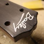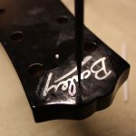 The guitar now has it’s topcoats of lacquer and is looking very shiny. Now it will hang for as long as possible before polishing. The longer its left the harder the finish and the easier it is to polish.