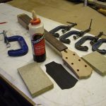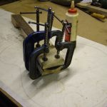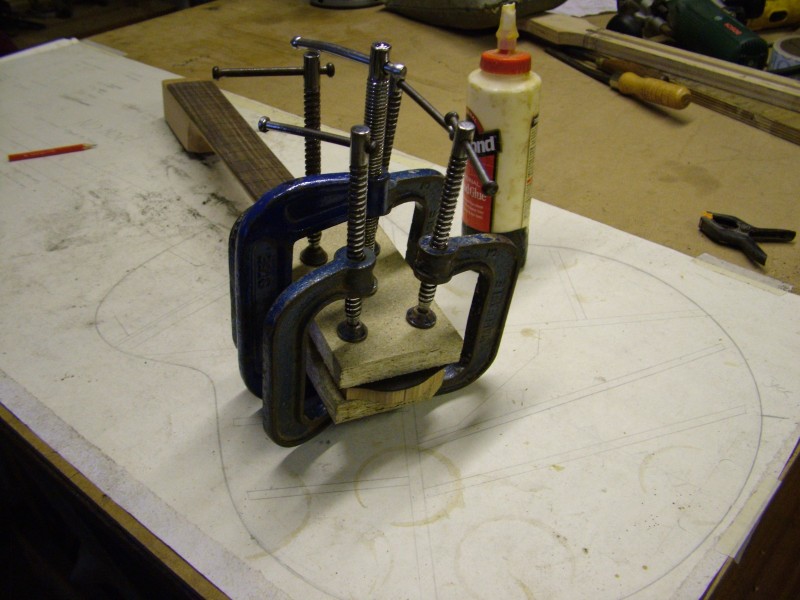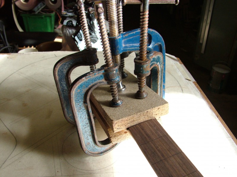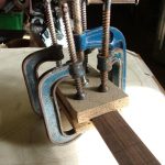 Blocks or ‘cauls’ are used to protect the wood while the piece is being clamped. I use titebond for this sort of job. The glue is left overnight to dry.