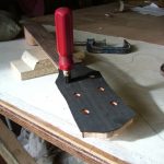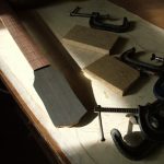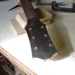 After this I tidied up where the oversized ebony veneer overhung the headstock shape. I did this with various sanding blocks and 80-120g sandpaper. It doesn’t take very long as the veneer is so thin……[email_link]