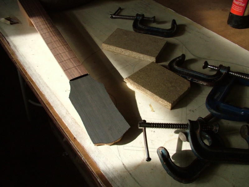 The ebony for the headstock veneer is about 1mm thick. I marked it oversize, then cut it out roughly on the bandsaw before gluing it on.