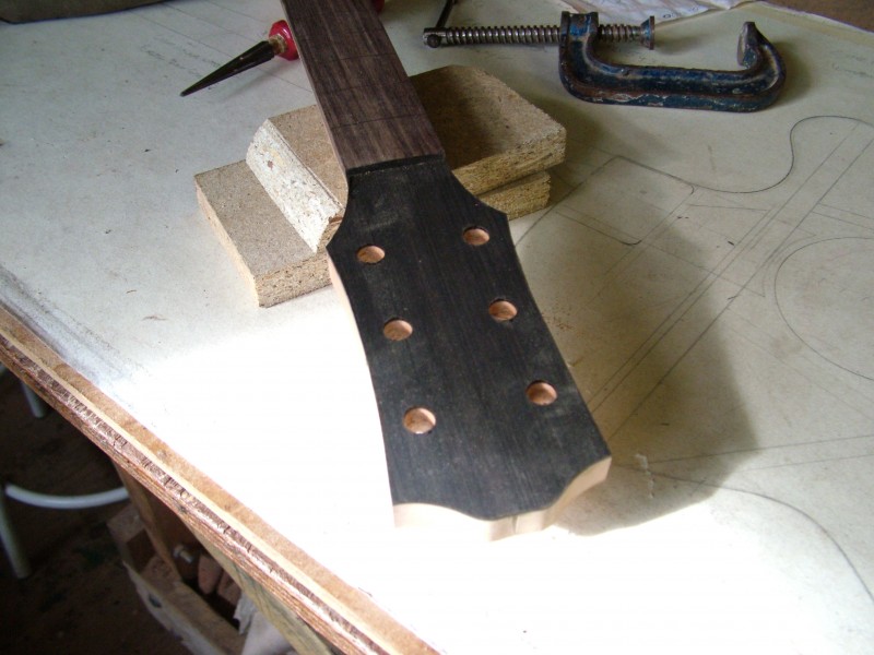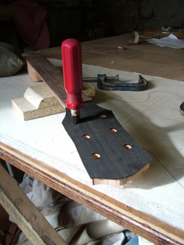 When the clamps have been removed the tuner holes have to be made through the veneer. A small drill makes the hole which is then reamed to size.