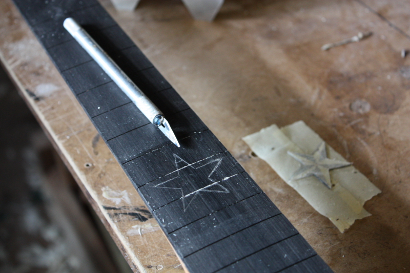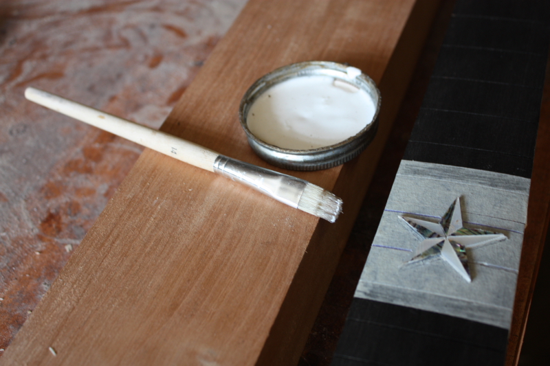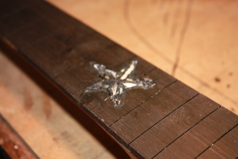You may remember Fiona a while ago making her Star inlay on our ‘build your own’ course. If you are interested I wrote a full explanation of how to inlay mother of pearl a while ago. Although the shape is different we used exactly he same method.