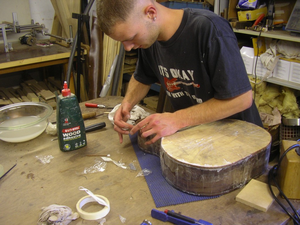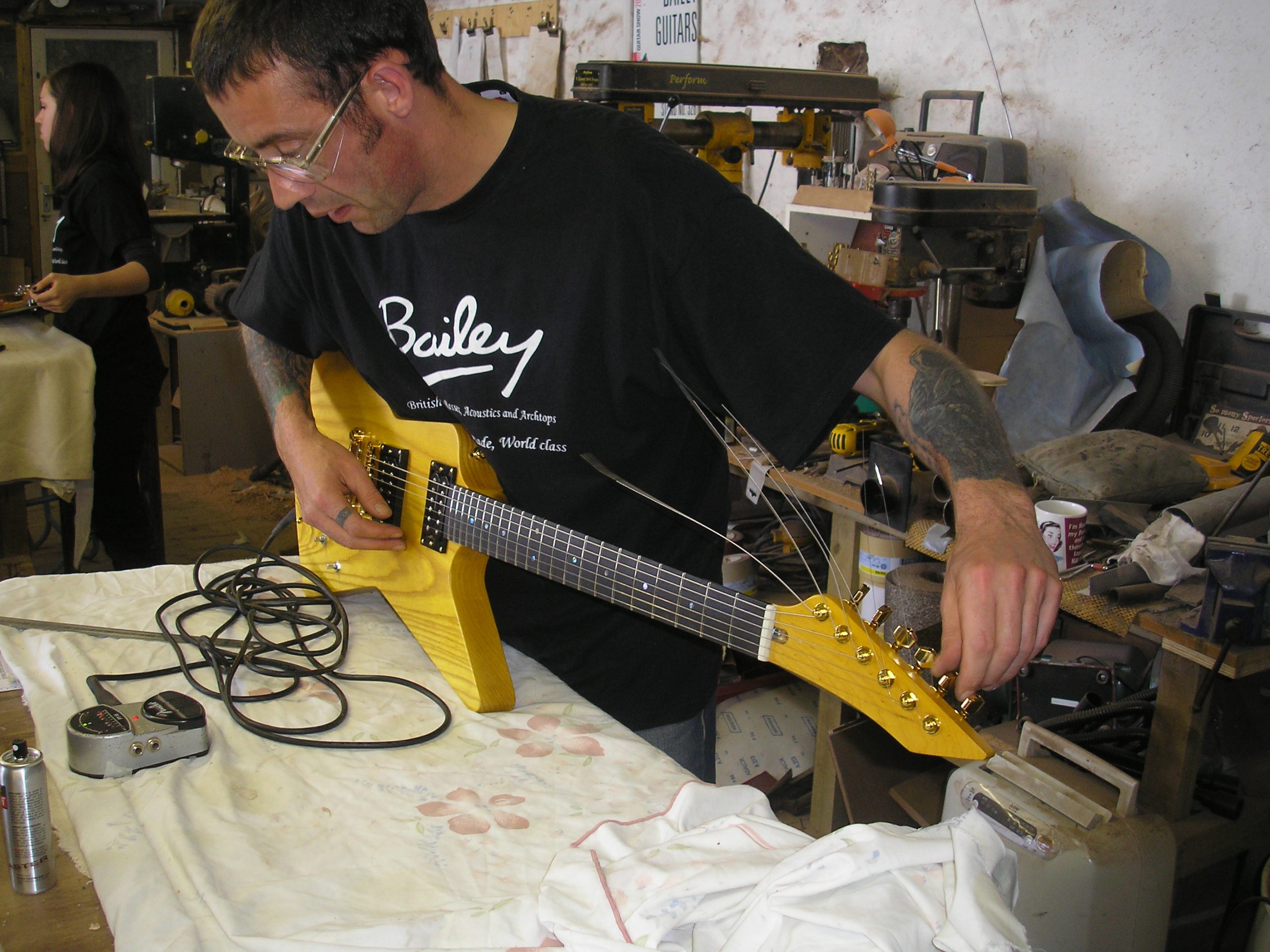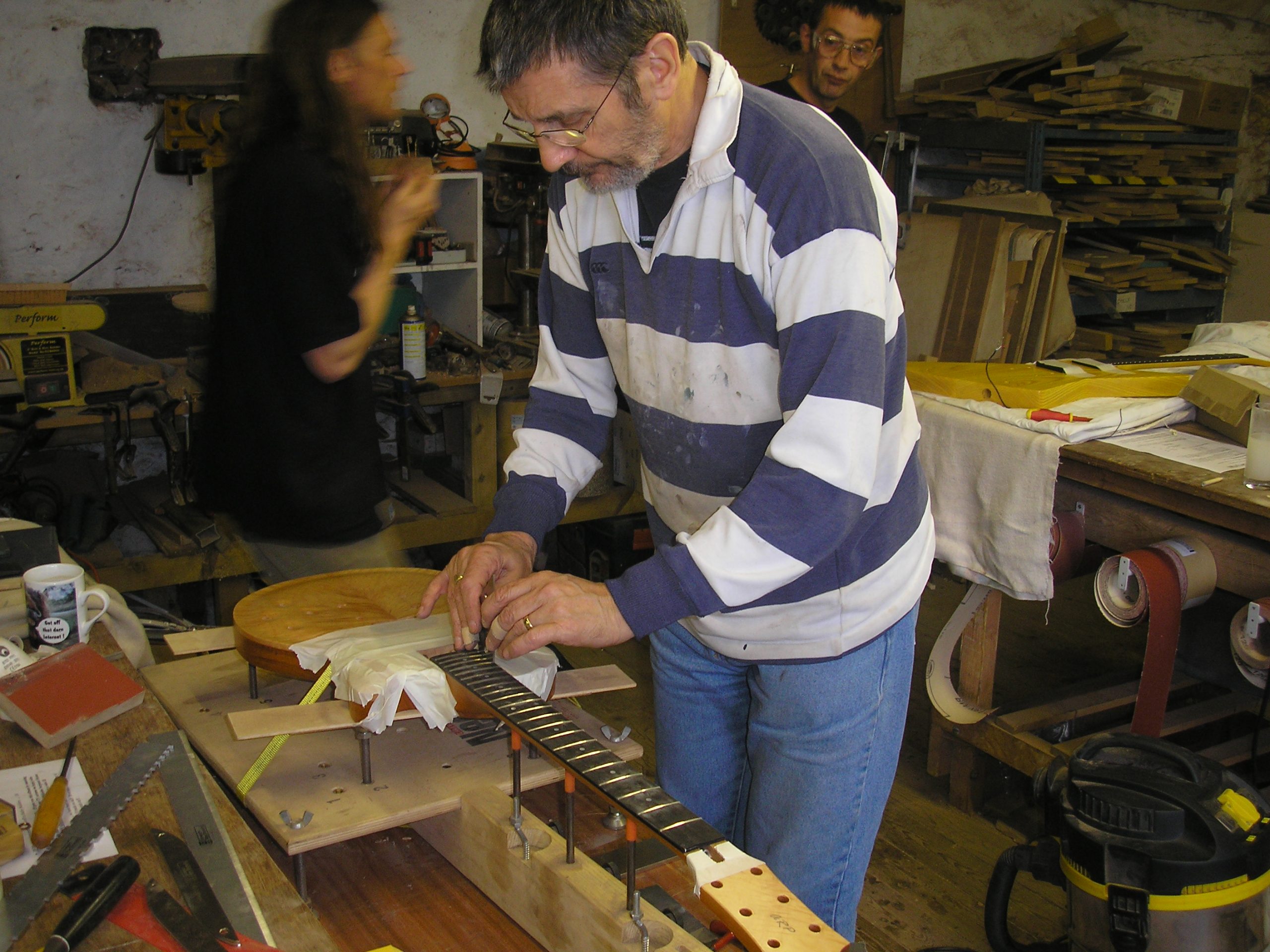 This is Tony on his last (Assembly) day (5) in the workshop. His guitar is strapped to the string tension simulator to make fret dressing more accurate. Only thing left to do after this is put the bits on, wire it up, and set it up. The last day is quite a full one! He will be emigrating to New Zealand with his guitars and his wife later in the year. Good luck Tony!!!