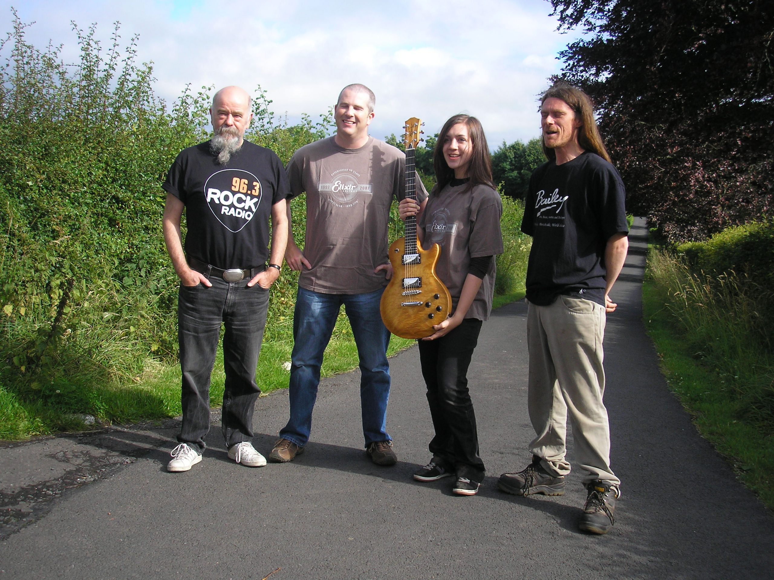 Left to right: Rock radio DJ Tom Russell, Bruce Falconer(BYO 228) of Elixir Strings, Rebekah – rock radio winner, and Mark.